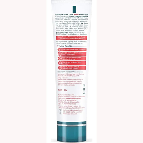 The Himalaya Natural Glow Kesar Face Cream is a skincare product formulated to nourish the skin, improve complexion, and reduce dark spots and blemishes. Translation Himalaya SINCE 1930 natural glow