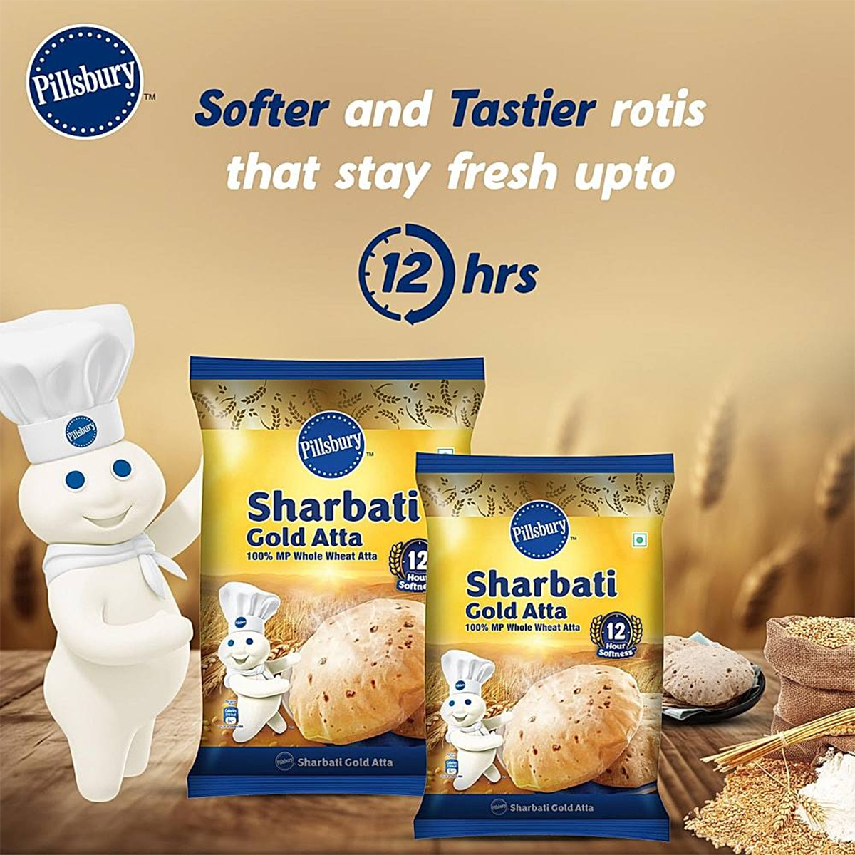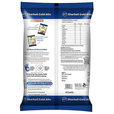 Pillsbury Gold Atta is made from Premium Quality 100% MP Whole Wheat, Sourced from Indias finest harvest- the pure & golden wheat fields of Madhya Pradesh. Pillsburys 150 + years of experience in wheat and wheat products ensure the Rotis made from Pillsbury Gold atta are deliciously soft, so soft you can tear them with just three fingers